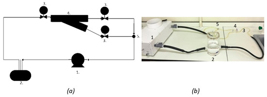 Suggested hydrodynamic flow system for future experimental work, including: (a) Pulsatile flow system schematic; and (b) pulsatile flow system laboratory. The proposed setup, as labelled in both (a,b) includes: 1. a pulsatile displacement pump which provides a dynamic pressure wave to the PDMS artery model within set-up system; 2. a compliance chamber to provide a back pressure to the artery, ensuring appropriate boundary conditions are applied; 3. the use of two-way isolation valves which should be compatible with a transient pressure transducer; and 4. PDMS model attached to the flow system via tubing; 5. a junction to join the flow after the artery bifurcation.