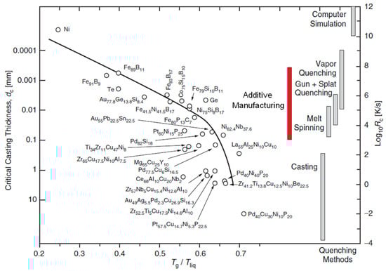 The critical cooling rate, Rc, and the critical casting thickness, dc, for various glass-forming metallic alloys vs. their reduced glass transition temperatures, Tg/Tliq, and the correlation with a variety of quenching techniques [2]. The highest critical cooling rate needed for single element metals to amorphize can only be generated using special nanoscale experimental techniques or by using computer simulations. By adjusting the process parameters in additive manufacturing (AM) techniques, it would be possible to achieve an effective cooling rate on the order of 103 to 108 K/s. The layer-wise nature of fabrication in the AM technique and the corresponding highly-effective cooling rate would provide n opportunity to manufacture MG-based components with complex shapes and desirable thicknesses using simpler alloy compositions (reproduced with permission [2]).