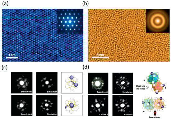 The SRO- and MRO-based model of the MG structure has been strongly supported by realistic computer modelling based on first principles calculations and large-scale molecular dynamics simulations [73,77,78,79,80,81,82,83,84], and was successfully applied to explain experimental observations [82,84,85,86]. It is also noteworthy that a “direct observation” of SRO and MRO structures in MGs have been recently reported in nanobeam electron diffraction (NBED) experiments by exploiting a subnanometer diameter electron beam to acquire the diffraction patterns from a nanoscale regions of the MGs [70], as shown in Figure 2c,d.