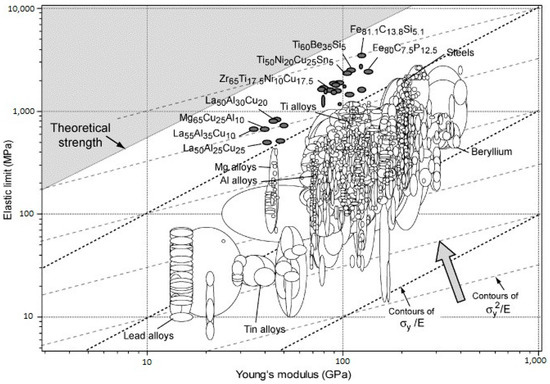 Elastic limit (yield stress) σy versus the Young’s modulus, E, for about 1500 conventional alloys, metal-matrix composites, and BMGs (annotated with compositions in at %). The contours are for the elastic strain limit (σy/E) and resilience (σy2/E) (reproduced with permission [91]).