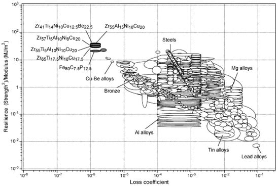 According to the discussions in the previous section, there are no crystallographic defects (e.g., dislocation slip systems) to mediate plastic deformation in MGs. Consequently, they exhibit ultrahigh yield stresses closer to their theoretical strength [5]. On the other hand, the elastic moduli of the atomic nearest-neighbour shell in MGs are similar to those in the corresponding metallic crystals [5,89]. However, topological instabilities occur under applied stress due to absence of long-range order, which leads to local anelastic deformations. These anelastic deformations appear macroscopically as lowered stiffness, i.e., a smaller Young’s modulus, E, than the corresponding crystalline counterpart [89]. As a result, MGs have an unusual combination of high yield stress, σy and low E. In Figure 3, mechanical properties of several representative MGs are compared with more than 1500 engineering alloys and other materials. This figure also presents the contour lines for the elastic strain limit, σy/E, which is remarkably high at about 2.67% deformation for a wide range of MGs [90]. Moreover, the resilience, σy2/E, lines are also presented in Figure 3. They are a measure of mechanical damping, i.e., the material’s capacity to store/restore elastic energy per unit volume. For further clarification, the material’s resilience, which is important, for example, in springs, is presented separately in Figure 4. Indeed, higher resilience correlates with a lower loss coefficient in cyclic elastic loading. The loss coefficient reflects the contribution of the local plastic flow in the energy loss [91]. It can be seen that metallic glasses are exceptionally resilient materials.