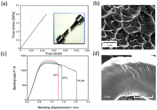 Figure 5. Ductility and failure of MGs under different loading conditions at room temperature (far below Tg). (a) A typical tensile fracture in which the plastic deformation is severely localized within a narrow single band and the MG exhibit almost no tensile ductility. Approximately 2% of the elastic elongation is observed. The inset shows the result of catastrophic failure of an MG sample upon tensile loading via the formation of a single shear band aligned at about 45° with respect to the loading direction; (b) in contrast with the brittle-like style of stress-strain curve shown in (a); the fracture surfaces of MGs display a typical vein morphology typical of “ductile” fractures; (c) bending loading test of MG samples, showing extensive bending ductility for different compositions; and (d) a prototypical Zr-based BMG sample could exhibit an extensive plastic deformation via multiple shear banding in bending tests. Regardless of overall observed ductility in (c); the plastic deformation in this case is still severely inhomogeneous (Adapted with permission [11]). - The fracture surface of MGs shows ductile features such as “vein patterns” or “river patterns” [2,98,99] (see Figure 5b).