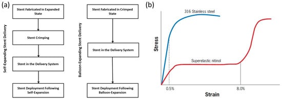 (a) Sequence of steps involved in the delivery of self-expanding (SX) and balloon-expanding (BX) stents; and (b) a comparison of the stress-strain behaviour of a typical BX stent material (316L stainless steel) and the most popular SX stent material (nitinol).