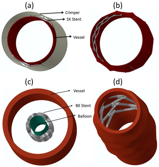 Deployment mechanics of SX and BX stents. (a) Arrangement of the crimper, the SX stent, and the blood vessel where the crimper is used to crimp the stent to a much smaller diameter; (b) the self-expanded stent in the blood vessel; (c) the arrangement of the balloon, the BX stent, and the blood vessel where the balloon is inflated to expand into the blood vessel; and (d) the balloon-expanded stent in the blood vessel.