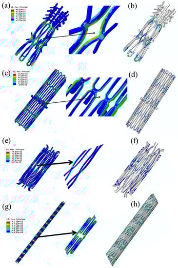 Finite element simulation of diamond-shaped stent crimping. (a) Maximum crimping strain in the mitral stent after crimping to 18F; (b) the critical locations in the mitral stent that would fail upon loading beyond 2% elastic elongation (colorful regions); (c) the mMaximum crimping strain in the caval stent after crimping to 24F; (d) the critical locations in the caval stent that would fail upon loading beyond 2% elastic elongation; (e) the maximum crimping strain in the aortic stent after crimping to 18F; (f) the critical locations in the aortic stent that would fail upon loading beyond 2% elastic elongation; (g) the maximum crimping strain in the Protégé stent after crimping to 6F; and (h) the critical locations in the Protégé stent that would fail upon loading beyond 2% elastic elongation (reproduced with permission [247]). The French scale or French gauge system is commonly used to measure the size of a catheter [249,250]. It is usually abbreviated as Fr or FR, or simply F. The French size is three times the diameter in millimetres [251]. For example, if the French size is 18, the diameter is 18/3 = 6 mm.