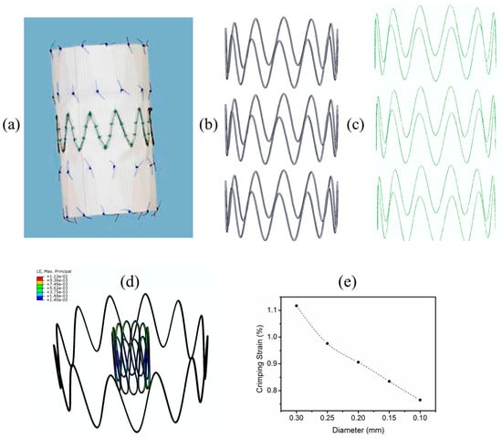 3D CAD Models and finite element simulation of Zenith stent crimping. (a) Zenith TX2 TAA Endovascular Graft [248]; (b) an isometric view of the CAD model of the bare metal wire based stent; (c) the stent meshed with beam elements; (d) maximum crimping strain in The Zenith stent after crimping to 22F; and (e) a crimping study showing the impact of stent wire diameter on the crimping strain. (Reproduced with permission [247,252]).