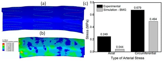 (a) During continuum modeling, stents are allowed to expand into the vessel until stress equilibrium is achieved between the stent and vessel; (b) a contour plot of von Mises stress distribution (S, von Mises) in the post deployment descending aorta when the stent material is BMG; and (c) a histogram comparing the axial and circumferential stresses in the artery after stent deployment with BMG as the stent material against experimental test results on the failure strength on human arteries (reproduced with permission [252]).