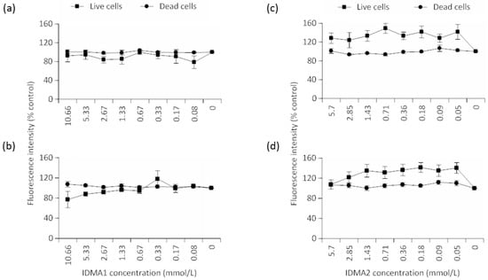 Percent control value of viability of HGF cells exposed to two-fold serial dilutions of IDMA1 (≤10.66 mmol/L) for (a) 24 h or (b) 72 h to two-fold serial dilutions of IDMA1. Percent control value of viability of HGF cells exposed for (c) 24 h or (d) 72 h to two-fold serial dilutions of IDMA2 (≤5.70 mmol/L). Data represent mean ± SEM for five independent replicates tested in triplicate.