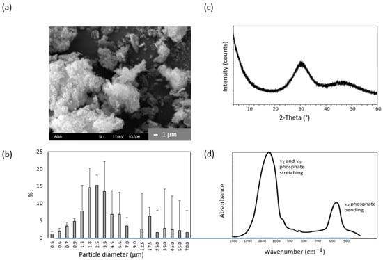 Validation of synthesized ACP. (a) Morphology of ACP particles under scanning electron microscopy (×3500 magnification); (b) Differential particle size distribution (mean values ± SD, n = 2); (c) XRD pattern; (d) FTIR spectrum of milled ACP utilized to fabricate ACP/UPE-IDMA composites.
