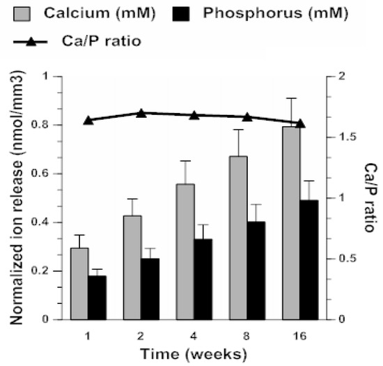 Kinetic profiles of Ca and phosphorus (P) release from milled-ACP UPE composites (Figure 7) revealed that within 4 months of aqueous immersion, a plateau (maximum) ion concentration had not been reached. The supersaturation conditions (SR >> 1) attained at any given time point were notably above the minimum necessary for the apatite re-deposition. It is particularly significant that the attained solution Ca/P ratio (average 1.66 ± 0.03) is practically identical to the apatite’s theoretical Ca/P value of 1.66, meaning that solution conditions created by composite’s immersion are highly conducive to apatite formation.