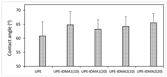 Changes in the overall hydrophilicity/hydrophobicity of the resins upon introduction of IDMAs (at 10 and 20 mass %) into UPE formulation. Indicated values represent mean ± SD for four replicate measurements.