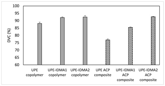 DVC attained in copolymers (near infra-red measurements; 24 h post cure) and the corresponding ACP composites; 15 min post-cure (curing conditions: 40 s, 500 mW/cm2). Shown are mean values ± SD for three replicate measurements.