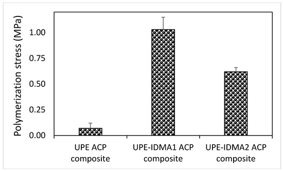 DVC results (Figure 9) revealed that in both copolymer and composite series, significant differences (p ≤ 0.001) existed between no IDMA, IDMA1, and IDMA2 formulations. The post-hoc multiple pair comparisons indicated that the observed up to 5% and 20% (copolymer and composite series, respectively) increases in DVC of IDMA-containing formulations are significant (p ≤ 0.001). It is noteworthy that the high DVC values (85.5–92.7%) attained in the experimental ACP UPE-IDMA composites were, generally, not accompanied with the excessive polymerization stress (Figure 10). Notably, in IDMA2 composites that reached the highest level of vinyl conversion, the measured polymerization stress was almost 40% lower than in IDMA1 composites.