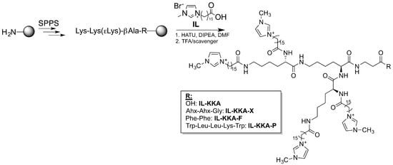 The conjugates presented are composed of a short amino acid sequence modified with four functionalized imidazolium groups [42,43]. Recently, we demonstrated that the lead compound, namely IL-KKA (cf. Figure 1), exhibited highly promising antimicrobial activity even against drug-resistant strains [44]. The functionalized membranes were characterized concerning the differently used immobilization strategies, and their physical as well as biological properties.
