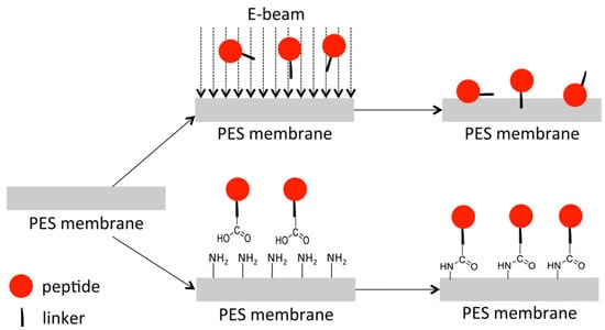 Schematic illustration of the two different immobilization strategies applied: using either electron beam irradiation or chemical coupling, respectively. For NHS/EDC activation, the PES membrane was activated with 2-aminoethylmethacrylate hydrochloride to obtain an amino functionalized surface.