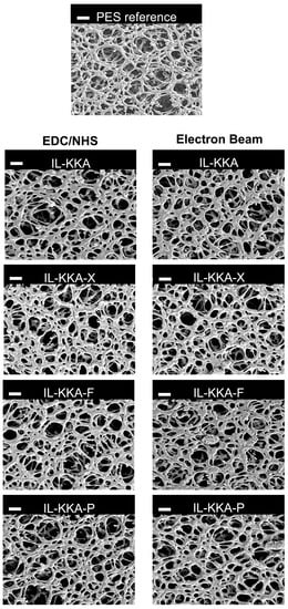 SEM images of PES membranes: reference membrane; after coupling with EDC/NHS (left), and after electron beam immobilization (right) of IL-KKA, IL-KKA-X, IL-KKA-F, and IL-KKA-P, respectively.