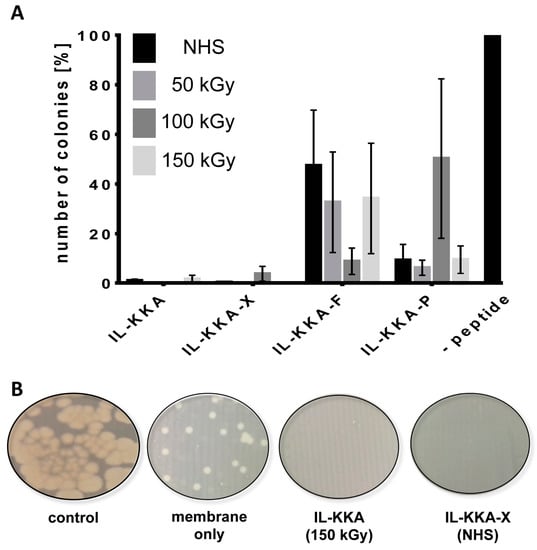 (A) Antimicrobial activity assay against B. subtilis (n = 3). PES membranes without peptides were used as a negative control and were set to 100%. Four different peptides, IL-KKA, IL-KKA-X, IL-KKA-F and IL-KKA-P were tested with different immobilization methods. NHS = covalent coupling via a peptide bond. (kGy = kGray) (B) Examples of distinct extracts of the agar plates treated with bacterial solutions that were incubated w/o membrane or any of the peptides (control), membrane only, or IL-KKA and IL-KKA-X, respectively.