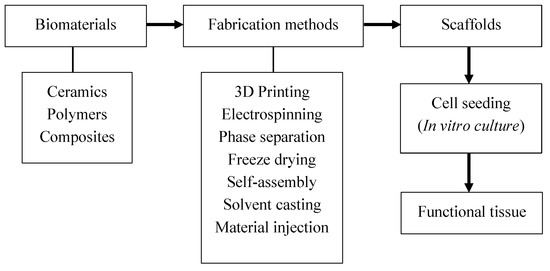 There are several methods for scaffold fabrication. The fabrication process is the step after which the biomaterials are transformed into scaffolds. These fabrication methods are physical and/or chemical processes that are performed on biomaterials to render them usable for tissue engineering. Not all biomaterials are suitable for a given fabrication method. Hence, biomaterials are constantly modified to enable their use in each fabrication method. Conventional fabrication methods include electrospinning, phase separation, freeze drying, self-assembly, solvent casting, textile technologies, material injections, and additive manufacturing [21,22]. Each fabrication method has its own advantages and disadvantages. To overcome certain disadvantages, these fabrication methods may be used in combination with other methods.