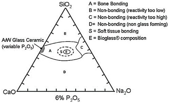 Compositional diagram for bone-bonding. Note regions A, B, C, D. Region S is a region of class A bioactivity where bioactive glasses (BGs) bond to bone and soft tissues and are gene activating. Reproduced with permission from [2].