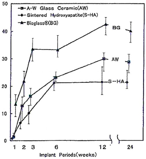 Oonishi et al. showed a correlation between the bioactivity class of the material and the rate of bone formation: class A bioactive material, such as 45S5 Bioglass®, promotes tissue formation more than class B materials that dissolve very slowly compared to 45S5 Bioglass® [40]. As Figure 2 shows, the bone growth rate into the inter-particle spaces is higher for BG, with respect to sintered HA and A–W glass-ceramic particles [40].