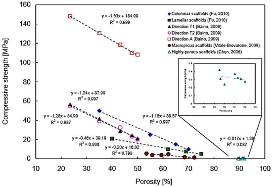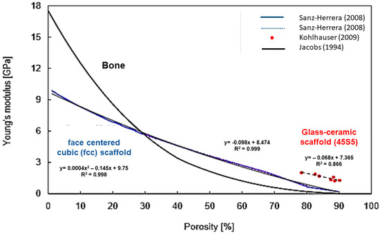 - Chen, Q.; Baino, F.; Spriano, S.; Pugno, N.M.; Vitale-Brovarone, C. Modelling of the strength-porosity relationship in glass-ceramic foam scaffolds for bone repair. J. Eur. Ceram. Soc. 2014, 34, 2663–2673. [Google Scholar] [CrossRef]