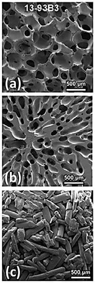 - Gu, Y.; Wang, G.; Zhang, X.; Zhang, Y.; Zhang, C.; Liu, X.; Rahaman, M.N.; Huang, W.; Pan, H. Biodegradable borosilicate bioactive glass scaffolds with a trabecular microstructurefor bone repair. Mater. Sci. Eng. C 2014, 36, 294–300. [Google Scholar] [CrossRef] [PubMed]