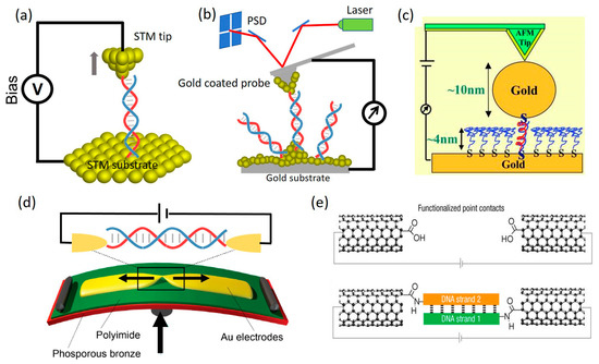 - Cohen, H.; Nogues, C.; Naaman, R.; Porath, D. Direct measurement of electrical transport through single DNA molecules of complex sequence. Proc. Natl. Acad. Sci. USA 2005, 102, 11589–11593. [Google Scholar] [CrossRef] [PubMed]