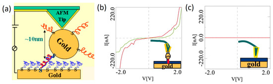 (a) Schematic of CPAFM-based method with a nanoparticle capped DNA molecule sandwiched between AFM tip and substrate; (b) Measured I–V curves of double strand DNA was performed on a metal particle without pressing on it; (c) I–V curve measured on the ssDNA monolayer without pressing it. Negligible current was observed here, indicating that the ssDNA monolayer is insulating. Reprinted with permission from ref. [51]. Copyright (2005) National Academy of Science, USA.