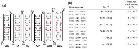 Effect of mismatched base pair on DNA conductance. (a) Mismatched DNA sequences studied in the work by Hihath et al.; (b) Measured single-molecule conductance of DNA molecules presented in (a). Reprinted with permission from ref. [69]. Copyright (2005) National Academy of Science, USA.