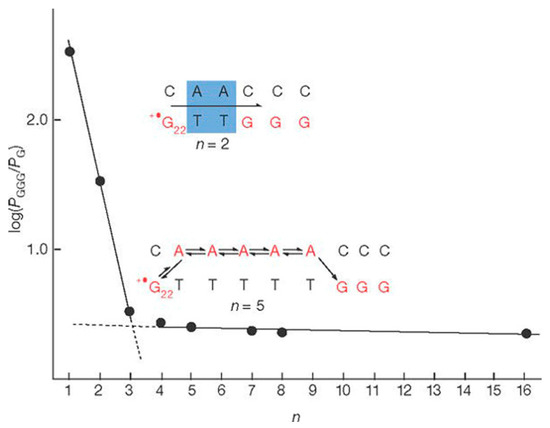 Although it was indeed supported by many photoinduced charge transfer measurements [73,74,75] in the early 2000s that long range transport through DNA was mediated by multistep hopping reaction involving positive charges (holes) moving between guanines (Gs), the DNA bases with lowest ionization energy, detailed experimental investigation yielded exceptions when specific DNA sequence was chosen. In 2001, Giese et al. [76] experimentally studied the rate of charge transfer through G bases of DNA, separated by adenine-thymine (A:T)n bridges of various lengths, in double strands. As shown in Figure 6, they found that the rate of charge transfer between two guanine bases decreases exponentially with increasing separation only if the guanines are separated by no more than three (A:T) base pairs; if more bridging base pairs are present, the transfer rates exhibit only a weak distance dependence. This distinct change in the distance dependence of the rate of charge transfer through DNA to a shift from coherent superexchange charge transfer (tunneling) at short distances was attributed to a process mediated by thermally induced hopping of charges between adenine bases (A-hopping) at long distances. This work highlighted that a change in charge transfer mechanism can occur in a distance-dependent fashion.