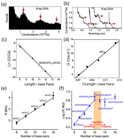 To gain deeper insight into the results obtained in the previous charge transfer measurements, researchers also interrogated the single-molecule conductance of various DNA sequences and lengths using the emerging STM-BJ technique. In 2004, Xu et al. [47] measured the single-molecule conductance of a series of dsDNA molecules containing different number of alternating (AT)m in the middle of alternating (GC)n bps in aqueous solutions. The experimental results are shown in Figure 7a–d. They found that for (GC)n sequences, the conductance is inversely proportional to the length (greater than eight base pairs) (Figure 7d). Contradictory to previous findings where short range transport through molecules was governed by tunneling [42], the conductance of short DNAs with (GC)n sequences decreases very slowly with the length. When inserting (A:T)m into GC-rich domains, it decreases exponentially with the length of A:T base pairs with a decay constant of 0.43 Å−1 (Figure 7c). It was highlighted that this decay constant of the studied DNAs is much lower than alkanes and peptides, indicating that DNA is much more conductive than alkanes and peptides. This work demonstrated different conduction mechanisms for different sequences even when the DNA is short. The results reported in this work were later confirmed in other measurements. Li et al. [77] recently reported conductance measurements of DNA molecules with similar sequences but longer length. In their work, the resistance (inverse of conductance) of DNAs with A(CG)nT sequences showed a linear length-dependence behavior (Figure 7e), consistent with the results in Xu’s work. In contrast, the resistance length-dependence of ACGC(AT)mGCGT/ACGC(AT)mAGCGT is significantly different. For m = 0, 1 and 2, the resistance increases more rapidly with length and can be best fitted with an exponential function. Within this range of molecular length, the results agree well with those in Xu’s work. For m > 2, however, the resistance becomes weakly length dependent, indicating a transition in the charge transport mechanism. This observation further verified the results reported in the DNA charge transfer rate measurements by Giese et al. (Figure 6). To briefly summarize at this point, it has been accepted now that the conduction mechanism of native dsDNA is dominated by tunneling (exponential dependence of conductance on length) when the G-C bps are separated by three or fewer AT bps. If the number of A-T bps is increased, diffusive hopping (linear dependence of conductance on length) becomes the main transport mechanism. However, for (GC)n sequences, the conductance of DNA is usually governed by thermally activated hopping with G bases as the hopping sites.