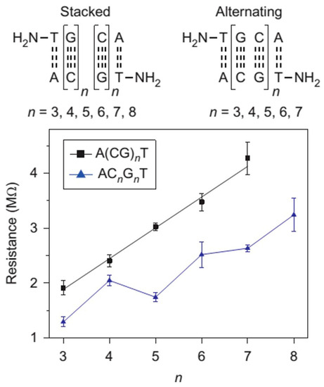 Single-molecule conductance measurements of DNA with alternating G (A(CG)nT) and stacked G (ACnGnT) sequences. Reprinted with permission from ref. [72]. Copyright (2015) Nature Publishing Group.