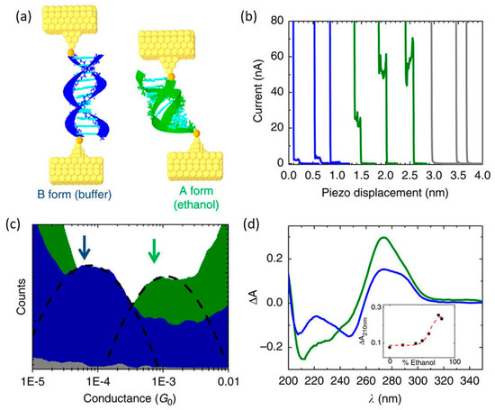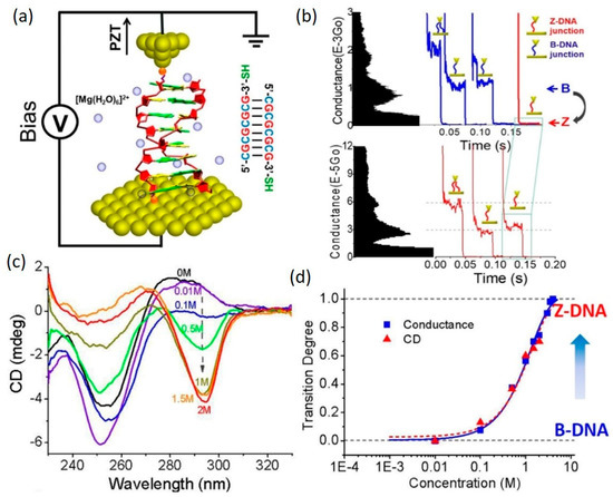 B-Z transition: using STM-BJ method, Wang et al. [79] studied the conductance change of a 8 bp poly(GC)4 DNA duplex induced by a structural transition from B- to Z-form (Figure 9a). In their work, the B- to Z-DNA transition was facilitated by increasing the concentration of Mg2+ ions in the buffer solution from 0 M to 4 M. The structural change was monitored and confirmed by circular dichlorism (CD) measurements (Figure 9c). Through measuring the single-molecule conductance of DNA, they found that the conductance of DNA molecule decreased by two orders of magnitude as DNA conformation transfers from B- to Z-form (Figure 9b). The cause of this conductance reduction is primarily attributed to the structural change-induced breaking of π-π orbital stacking between neighboring bps which may come from a few sources, including the rise between adjacent bps by 14%, axial angle twist from 36° in B-DNA to −30° in Z-DNA and flipping of G bases by almost 180°, which have a detrimental effect on distribution of effective orbitals for CT. Therefore, DNA in Z-form is not suggested for molecular electronics applications. Interestingly, this work also showed that when three A-T bps were bridged in the middle of the (GC)4 sequence, such B-Z structural transition effect was not present and therefore no significant change in DNA conductance was observed even when Mg2+ concentration in the solution increased from 0 M to 4 M. It was also highlighted that the B-Z transition can be monitored simply by measuring the conductance of the DNAs even when traditional method such as CD fails (Figure 9d).