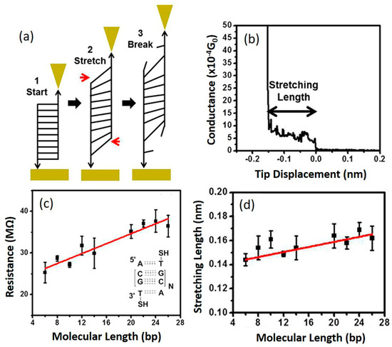 Stretching effect of DNA conductance. (a) Illustration of the evolution of dsDNA duplex during stretching; (b) Example conductance trace for dsDNA sequence 5′-S(CG)2T-3′; (c) Resistance vs. molecular length plot; (d) Stretching length vs. molecular length plot. Reprinted with permission from ref. [98]. Copyright (2015) American Chemical Society.