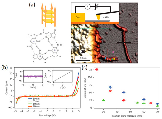 (a) biotin-avidin (BA)–G4-DNA scheme showing an oriented ordered stack of tetrads and AFM image showing a typical measurement scenario: a gold electrode with a sharp edge is on the left and molecules are clearly visible on the mica to the right; one molecule (at the bottom) is protruding from under the edge of the metal electrode; (b) I–V measurements taken at the positions indicated by colored dots on the molecule shown in (a); (c) Distance dependence of the current measured at a bias of 5 V for three different molecules (plotted in different colors). Reprinted with permission from ref. [102]. Copyright (2014) Nature Publishing Group.