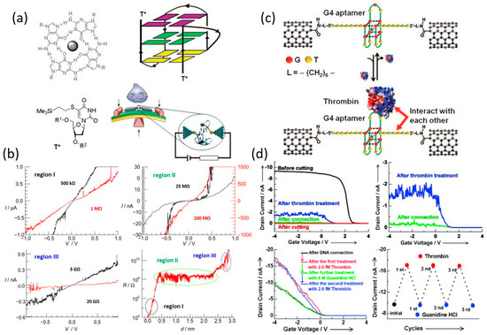 Single-molecule conductance of short G4-DNA has also been performed recently using single-molecule break junction methods. Using the MCBJ approach, Liu et al. measured the conductance of a short G4-DNA (5′-T*G3[TTAGGG]3T*)-3′, T* is modified thymine to couple the molecule to the electrodes) which was covalently bonded to Au electrodes through thiol-Au interaction [104]. In their study, a pronounced and flat conductance plateau with a length of around 2 nm was observed (Figure 13b, bottom-right panel). It was noticed the plateau resistance remains almost constant while the G-quadruplex conformation is present. I–V measurements performed at the molecular plateau region showed a highly non-linear, with a typical S shaped I–V curve of G4-DNA. Although detailed transport mechanism was unclear, this work also showed that G4-DNA can transport considerable current at reasonable voltages in the range of 1 V. More importantly, contrast to dsDNA, the resistance of the G4-DNA molecule is quite independent of the elongation of the molecule. Liu et al. recently studied the possibility of using SWCNT-G4-DNA-SWCNT junction as a protein-detection device [109]. Their experimental setup involved connecting a 15-mer thrombin DNA aptamer with thymine 7 (T7) linkers on both the 3′ and 5′ termini to nanogapped SWCNTs, as shown in Figure 13c. Under a constant source-drain voltage of −15 mV, the current vs. gate voltage signal was constantly monitored when the G4-DNA aptamer was connected between the SWCNTs before and after thrombin treatment. It was found that the current of the SWCNT-G4-aptamer-SWCNT junction increased dramatically upon treatment of thrombin and this change is reversible over several cycles by alternating treatment with thrombin (2.6 fM) and guanidine HCl (6 M). To understand the drastic conductance change induced by G4-DNA interacting with thrombin, they hypothesized that DNA–thrombin interactions do not distort the G4 conformation, but instead rigidify the G4 conformation and promote tight packing, thus enhancing the conductance of the G4-DNA. Apart from measuring CT through G4-DNA, their work demonstrated how G4-DNA can be used to interface with biological processes for the development of bio-detection devices.