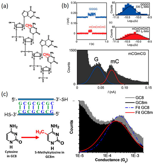 Among DNA modifications, DNA methylation constitutes an essential epigenetic mechanism for various important biological processes such as embryonic development, replications, and aging [110,114,115]. Beyond its significant role as a biomarker closely associated with human health and disease, DNA methylation has also been regarded as one possible method to tune the CT properties of native DNA as it is anticipated to affect the π-conjugation of the pyrimidine (or purine) bases considering the electron-donating character of methyl substitutions [110]. In 2011, Tsutsui et al. [110] reported their experimental investigation of the effects of methylation on the conductance of deoxycytidine-5′-monophosphate. The studied DNA 4-mers have sequences of 3′-mCGmCG-5′ and 3′-GGGG-5′, where cytosine bases were methylated, as shown in Figure 14a. The conductance measurements were carried out using MCBJ method under a constant bias of 0.4 V. It is worth noting that the measurements were performed transverse to a ssDNA rather than longitudinally as in most of the other papers discussed. Upon statistically collecting the electrical signal when a DNA oligomer was trapped between Au electrodes, they found that methyl substitution contributes to increase the tunneling conductance of deoxycytidines (Figure 14b). This conductance increase was attributed to a shift of the highest occupied molecular orbital level closer to the electrode Fermi level by methylation. This result also suggested a possible use of the transverse electron transport method for a methylation level analysis.