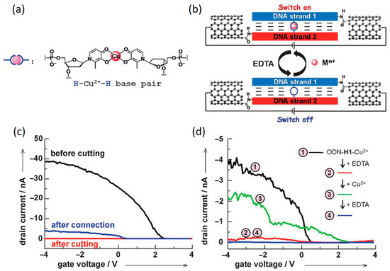 (a) The molecular structure of Cu2+ mediated base pair; (b) Components of metallo-DNA-bridged SWCNT devices; (c) Current vs. gate voltage signals of a device reconnected with metallo-DNA (blue); (d) Current vs. gate voltage under periodic treatment of Cu2+ and EDTA. Reprinted with permission from ref. [112]. Copyright (2011) Wiley–VCH Verlag GmbH & Co. KGaA.