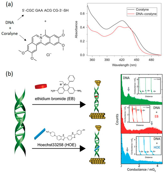(a) Sequence of dsDNA, structure of coralyne molecule and their interaction revealed by UV-vis spectra. Reprinted with permission from ref. [9]. Copyright (2016) Nature Publishing Group. (b) Conductance measurements of dsDNA molecules with EB and HOE intercalated between the base pairs and into the grooves, respectively. Reprinted with permission from ref. [113]. Copyright (2017) Royal Society of Chemistry.