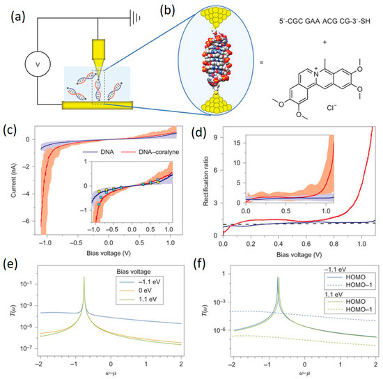 The goal of molecular electronics is to functionally incorporate molecular components in electronic devices. The key to achieving this goal is to search for molecular candidates that mimic the electronic behavior of conventional semiconductors, such as diode (rectifier), which facilitates current flow in one (forward) bias direction, and transistor, current flow of which can be controlled with a gate voltage. To date, the diode-like (rectification) behavior has been observed in molecular junction devices involving small organic molecules, the structures of which usually comprise electron-donor and electron-acceptor groups [123,124,125,126]. The cause of such rectification behavior has been attributed to two main factors, asymmetric electronic structures of the molecular core [124,127] and asymmetric coupling at the two molecule-electrode contact interfaces [128,129]. For details of this topic, we refer readers to several excellent reviews (see refs. [50,127,128]). However, research using DNA as a molecular diode has been lagging behind due to poor understanding of its structure-property relation. There have been few experimental attempts until very recently. The first successful demonstration of a DNA-based molecular rectifier was reported by Guo et al. in their recent publication [9]. They created a DNA-based rectifier by intercalating two coralyne molecules into specifically designed duplex DNA molecule (5′-CGCGAAACGCG-3′) (Figure 17). The three mismatched A-A bps at the middle of the sequence facilitated the intercalation of coralyne molecules into the DNA, which turned out to significantly modulate the electronic structure of the treated DNA (Figure 17a,b). Electrical measurements of single DNA-coralyne complex molecular junctions using STM-BJ method revealed rectifying I–V characteristics with a high rectification of around 15 at 1.1 V (Figure 17c,d). It was noted that this is a completely counterintuitive finding considering the apparent structural symmetry of the DNA-coralyne complex. Therefore, an unprecedented transport mechanism for molecular rectification was proposed. In the new mechanism, the rectification behavior was caused by the coralyne-induced local spatial asymmetry of the distribution of electron states along the DNA chain, which results in an asymmetric change in the transmission function associated with the HOMO-1 level of the molecule. This work offered a new strategy for engineering molecular electronic elements by exploiting DNA-small molecule interaction and will ignite new interest in DNA-based functional molecular electronic devices.