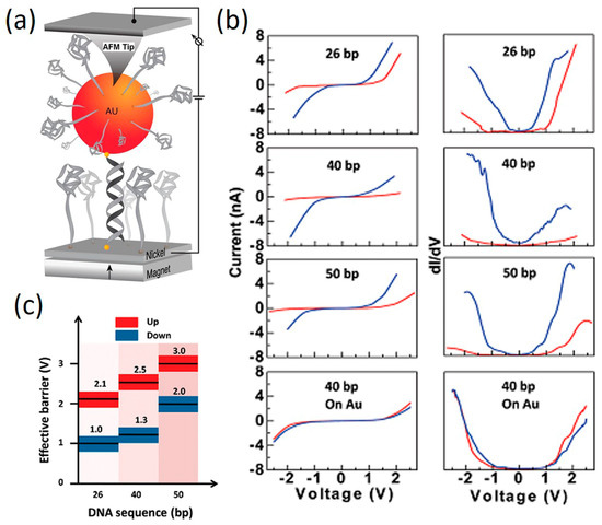 The fact that electron can travel through chiral molecules in a spin selective manner raised the intriguing possibility that DNA CT is affected by the inherent spin of the electrons passing through it. It has been found that DNA duplex can act as a spin filter for spin selective transmission of electrons [131]. This was demonstrated in photoemission spectroscopy of DNA monolayers on Au [132] and in electrochemical charge transfer measurements on DNA monolayer films [133]. Xie et al. [134] recently reported a magnetoresistance measurement of DNA using a CAFM-BJ setup. In their work, a platinum-coated conductive AFM tip measures the current flowing from a nickel substrate through the DNA to a gold nanoparticle (Figure 19a). I–V characteristics were obtained for DNA duplex molecules with different lengths under two magnetic field polarities (up and down) (left column in Figure 19b). They found that the I–V curves are symmetrical with respect to zero bias, but I–V curve for Ni depends strongly on the magnetic field orientation. The magnetic field of the permanent magnet has little effect on the current flow through the DNA, but the magnetic field does affect the spin alignment in the Ni substrate. The lower traces in Figure 19b show a control experiment in which the Ni electrode was replaced by an Au electrode, which is non-ferromagnetic, and no magnetic field effect was observed. Since the dI/dV curves (right column of Figure 19b) reflect the density of states for each system qualitatively, carrier density can then be used extract an effective tunneling barrier height, as shown in Figure 19c. The difference in spin selectivity for the different DNA lengths enlarges because the effective barrier associated with the unfavorable spin is smaller for the shorter oligomers. Hence, electrons with this unfavorable spin produce higher conductance. Due to larger effective barriers for longer DNA molecules, the current associated with the unfavorable spin is blocked.
