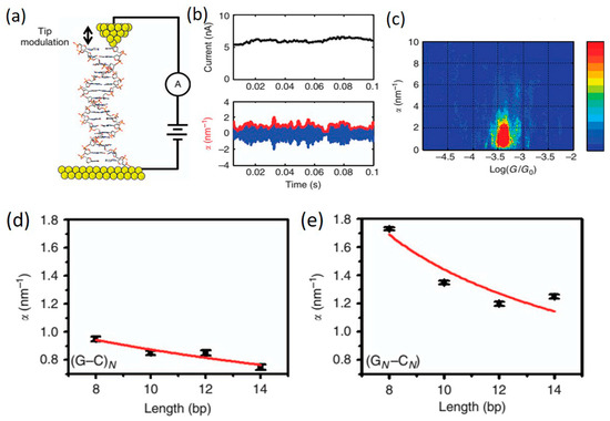 (a) Schematic diagram of STM-BJ with a modulating tip; (b) Upper: low-frequency component of the current collected from the single DNA junction; lower: the piezoresistance (α) in DNA (red curve) and conductance modulation due to tip modulation (blue curve); (c) α vs. conductance histogram for G-C sequence; α vs. molecular length for (d) (G–C)N and (e) (GN–CN) sequences, respectively. Reprinted with permission from ref. [138]. Copyright (2015) Nature Publishing Group.