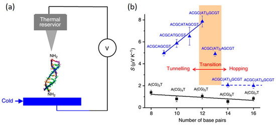 - Li, Y.; Xiang, L.; Palma, J.L.; Asai, Y.; Tao, N. Thermoelectric effect and its dependence on molecular length and sequence in single DNA molecules. Nat. Commun. 2016, 7, 11294. [Google Scholar] [CrossRef] [PubMed]