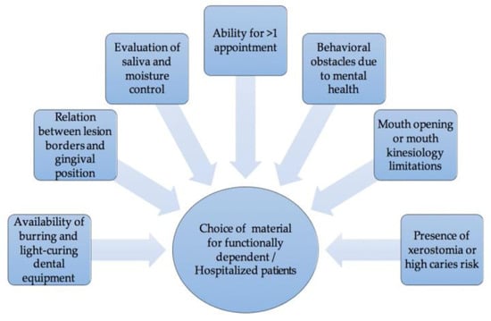 When it comes to hospitalized geriatric patients or patients who are not capable of visiting a dental office, a clinician should include several factors to pick the most suitable material (Figure 1). The availability of burring and light curing dental equipment, the relation of the position of the lesion and the gingiva, the evaluation of saliva and moisture control, the lack of opportunity for more than one appointment, the presence of xerostomia, health conditions which affect mouth opening or mouth kinesiology, and behavioral obstacles are all issues to be considered. Ideally, when a portable dental office can be used, RMGI should be chosen, just like at a dental office. In xerostomic patients and in subgingival wet environments, conventional glass ionomers are again the first material choice, except if a second appointment for the finishing and polishing of the restoration is impossible. Otherwise, when the essential dental equipment cannot be transported, or the oral and mental condition of the patient do not allow it to be used, the Atraumatic Restorative Treatment should be applied. Features, such as bonding to sclerotic dentin [], maintenance of adhesion for long periods and high retention rates [], high fluoride release [] and compatibility with the thermal expansion coefficients of hard tooth tissues, that make mechanical retentions unnecessary and save the remaining tooth structure [] make conventional glass ionomers the material of choice for the ART approach []. It is important to remember that before the placement of the restoration the lesion should be disinfected with use of a pumice-water paste or 2% solution of chlorhexidine-gluconate, in order to decrease the microbial load, as mentioned above. The process of choosing the restorative material for NCCL in geriatric patients is summarized in Figure 2.