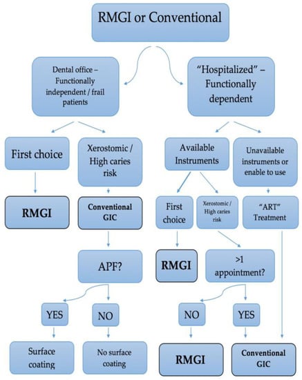 Depending on their ability to seek dental services, the elderly could be categorized into three broad functional groups. The first group is the functionally independent older adults, who live unassisted and can access dental care independently using their own vehicles or public transportation. They may have chronic medical problems, such as hypertension, type II diabetes, osteoarthritis, etc., and they correspond to 70% of the ageing community. The second one is the frail older adults, who are partly dependent on the help of friends and family for their access to dental services. They comprise about 20% of the population over the age of 65 years. The last group consists of people who are not able to survive in the community independently and are either home-bound (about 5% of the population over 65) or live in institutions or hospitals (another 5% of the population over 65). These functionally dependent older adults can only have access to dental services if they are transported to a dental office or, when this is impossible, the services are brought to them through mobile programs []. Portable dental equipment, such as a domiciliary valise or a portable dental office, can be used to take care of patients of this group at their nursing home or hospital []. Oral health of the hospitalized elderly is poor and most of them are in need of restorative dental treatment. However, functional disability and autonomy loss of these patients is an obstacle in care implementation and often limits care to emergency cases. Many of them are unable to open their mouth properly or can only keep it open for a few moments. As a result, the duration of dental intervention must be as short as possible [,,]. Under these conditions Atraumatic Restorative Treatment may be the most suitable choice of dental care. GIC is considered to be the material of choice [,]. A meta-analysis showed that ART restorations in posterior Class V cavities in permanent teeth have a 28% higher chance of being successful than that of amalgam restorations after 6.3 years [].