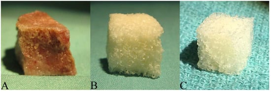 Macroscopic Field Images: (A) Donor cancellous bone harvested from the distal metaphysis of porcine femurs; (B) Bone scaffold derived from donor specimens using a patented decellularization and oxidation protocol that combines physical and chemical processing treatments; (C) Commercial Demineralized Bone Matrix (CONFORM® FLEX Demineralized Cancellous Bone, DePuy Synthes, Distributed by Musculoskeletal Transplant Foundation).