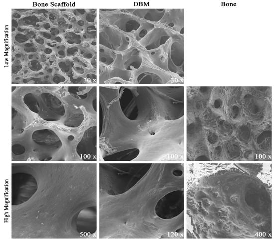 Donor porcine bone, scaffolds, and DBM samples were mounted on aluminum stubs (Ted Pella, Redding, CA, USA) with carbon tape and gold sputter coated at 30 mTorr. Specimens were imaged on a Hitachi S-2600 scanning electron microscope (Hitachi, Tokyo, Japan).