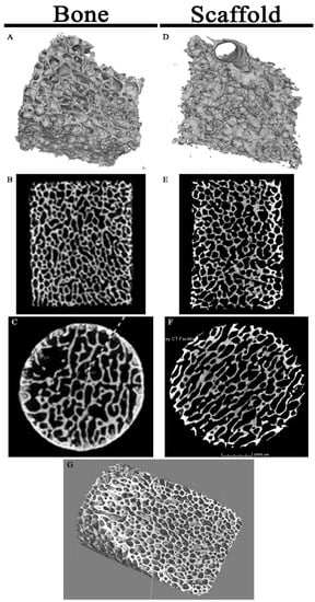 Micro-CT Imaging of Specimens: Porcine cancellous bone micrographs (A–C) and scaffold micrographs (D–F) were similar in appearance on 3-dimensional projections (A,D), coronal (B,E), and axial (C,F) cuts. (G) High resolution scaffold 3-dimensional projection through the matrix interior displays the highly porous architecture.