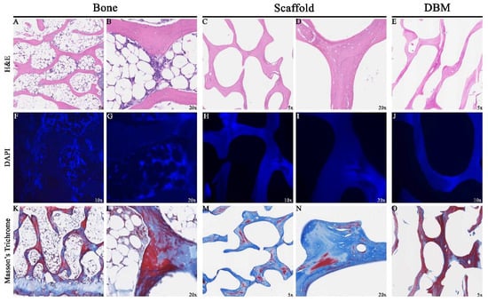 H&E stained sections showed that marrow contents (Figure 4A,B) and osteocytes within lacunae of donor bone were removed after decellularization (Figure 4C,D). Consistent with these findings, 4′,6-diamidino-2-phenylindol (DAPI) stained sections showed an abundance of nuclear material in the source bone (Figure 4F,G) that was removed after decellularization (Figure 4H,I). DBM sections (Figure 4E,J,O) were similar in appearance to scaffold sections.