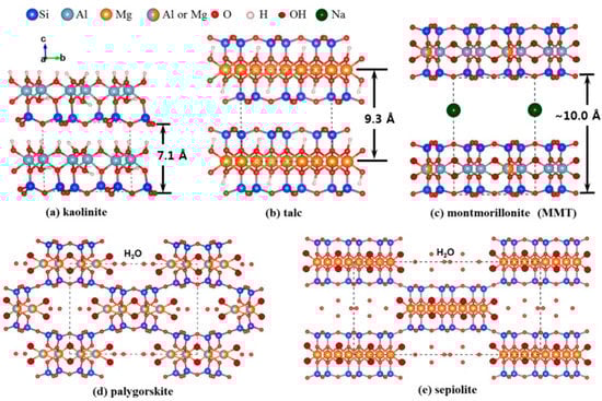 Crystal structure of the pharmaceutical used clay minerals: (a) kaolinite; (b) talc; (c) montmorillonite; (d) palygorskite; and (e) sepiolite. Dashed lines represent the unit cell. Reproduced with permission from [12].